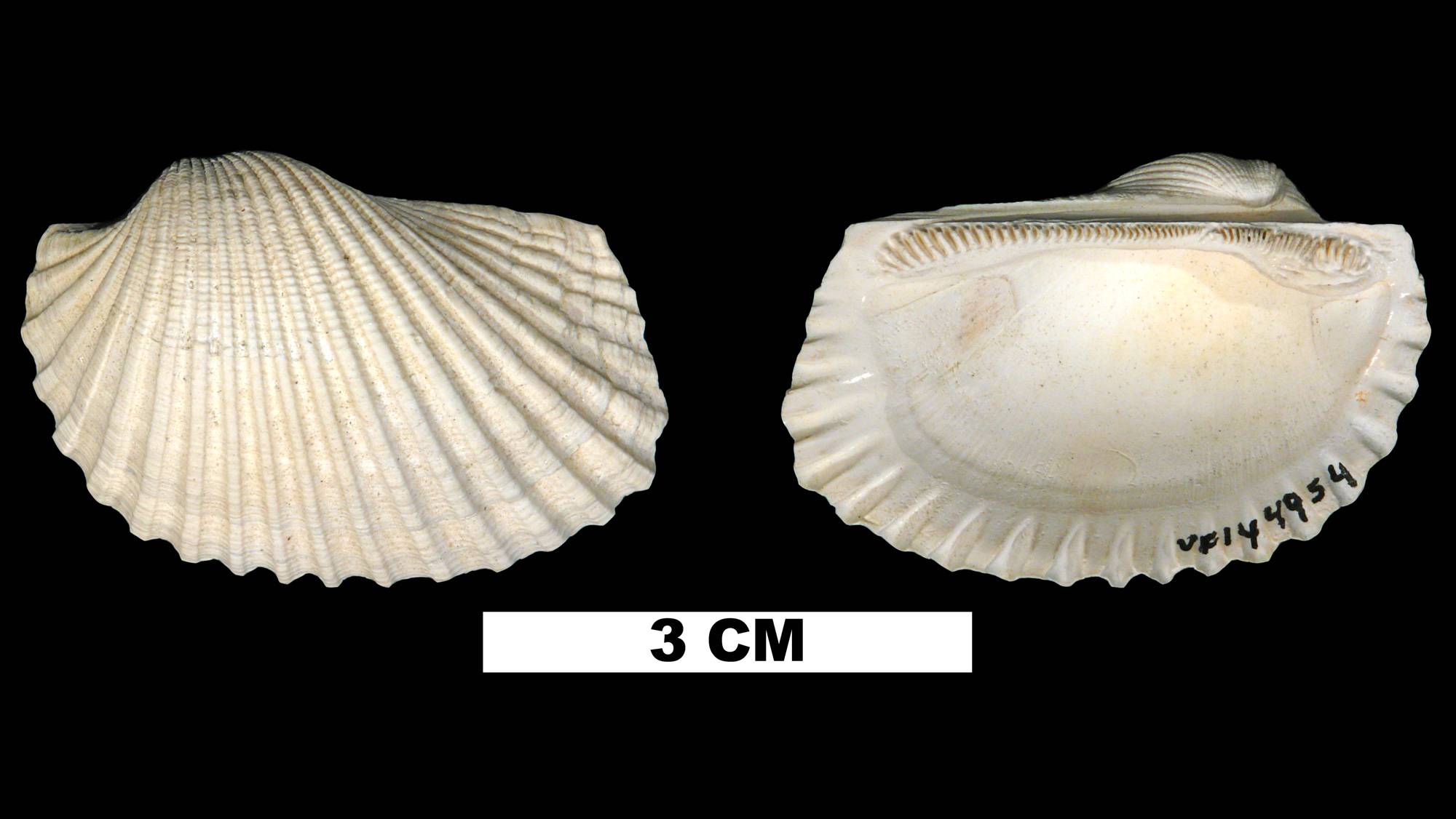 From Dall (1898, pp. 656, 657): “Chesapeake Miocene or upper bed at Alum Bluff, Florida; Dall and Burns. Shell of moderate size, solid, and heavy, with a straight and angulate upper margin, obliquely rounded anterior, produced posterior, and arcuate basal margin ; beaks low, much incurved, mesially impressed, and rather anterior; left valve with about twenty-two narrow ribs separated by wider interspaces, crossed by little elevated, regularly spaced incremental lines; the ribs are not nodulous, the anterior ones are flattish or rarely have a shallow sulcus mesially near the margin; they are subequal, but in specimens in which the mesial depression of the valve is especially strong, the ribs included in it are narrower and closer together than usual ; hinge-line nearly as long as the shell, angular, but not auriculate distally ; the beaks are within the anterior third; cardinal area wider in front, narrow behind, longitudinally striated with a few grooves which circumscribe a “stemmed” arrow-head figure, few of them reaching as far forward as the beaks; teeth in two adjacent series, the anterior shorter with a pronounced thickening of the shell below it, over the vertical face of which the teeth extend rather irregularly or are supplemented by denticular wrinkles; posterior series longer, numerous, vertical, distally much wider, and more or less oblique ; interior margin of the valves with strong, short flutings. Lon. 47, alt. 28, diam. 27 mm. This is quite a peculiar species, the teeth of which recall Argina , while all the other characters of the shell indicate its section to be Anadara , another instance, if one were needed, to illustrate the mutability of the dental forms in this family. It cannot be confounded with any of our other species.”