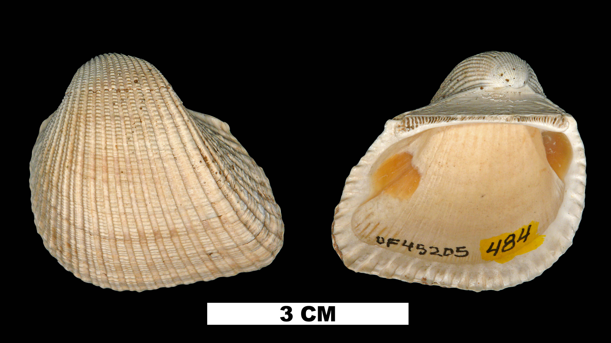 From Dall (1898, p. 641): “Oligocene of the Chipola River marl, of the lower bed at Alum Bluff, of the Sopchoppy limestone, and of the Oak Grove sands, Santa Rosa County, Florida; Burns and Dall. Shell small, short, plump, rostrate, with moderately elevated, mesially sulcate prosocoelous beaks; left valve with thirty elevated, squarish, radial ribs, separated by slightly narrower channelled interspaces; the ribs on the posterior slope are low, smaller, and nearly smooth; those on the middle of the shell have mostly near the margin a shallow mesial sulcus; in those still more anterior the sulcus is deeper and wider, dividing each rib over most of its length into two more or less rounded riblets; concentric sculpture of regularly spaced elevated lines, which on the ribs appear as prominent ripples; right valve having the ribs narrower and less strongly sculptured, and the sulci less distinct; cardinal area short, with about three concentric grooves; beaks within the anterior fourth; hinge-line short, with about fifty-seven rather irregular, closely adjacent, nearly vertical teeth, longer and more oblique distally; margins strongly fluted; base flexuous, posterior end narrow, pointed, without any marked angle at the end of the hinge-line. Lon. 36.5, alt. 28, diam. 28 mm. This species is most nearly related to A. staminata Dall, from which it can be distinguished especially by its lower beaks, more oblique posterior slope, more flexuous base, and attenuated posterior end.”